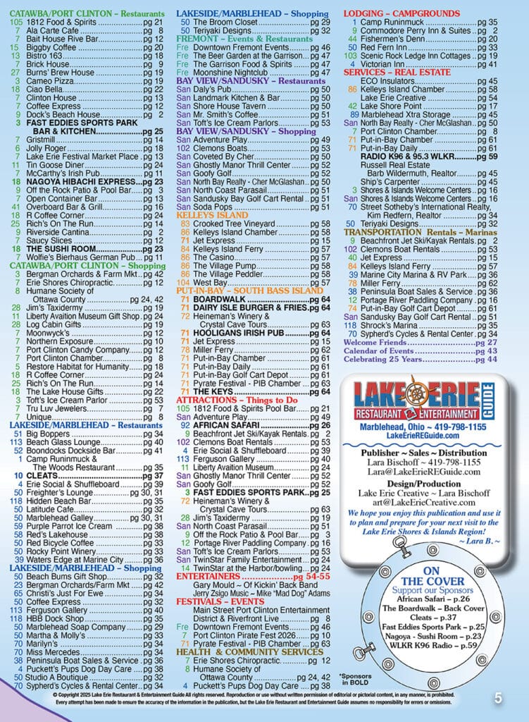 The chart above is a generalized map of the Lake Erie north coast destinations of Catawba, Port Clinton, Lakeside, Marblehead, Bay View, Sandusky, and the Island areas of Put-in-Bay (South Bass Island) and Kelleys Island. For those vacationing along the north shore of Lake Erie, our printed magazine provides an index and map locator guide for area venues including restaurants, shopping, lodging, fishing, entertainment and attractions.